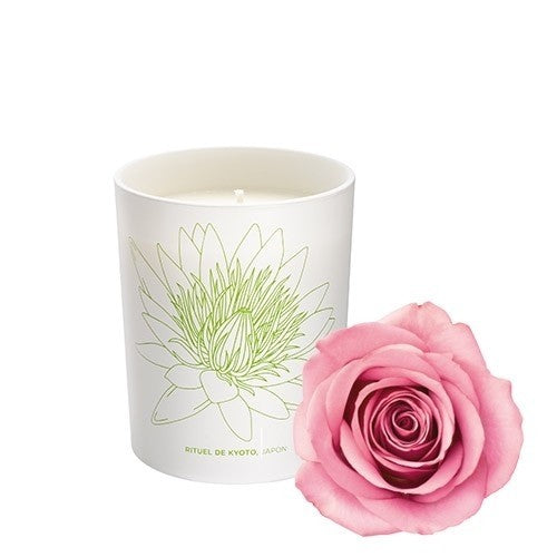 Composée de cire 100% végétale et sans huile de palme, la Bougie Aromatique (Rituel de Kyoto, Japon) libère sa douce fragrance composée d’huiles essentielles d’Absolu de rose et de gingembre aux vertus énergisantes.